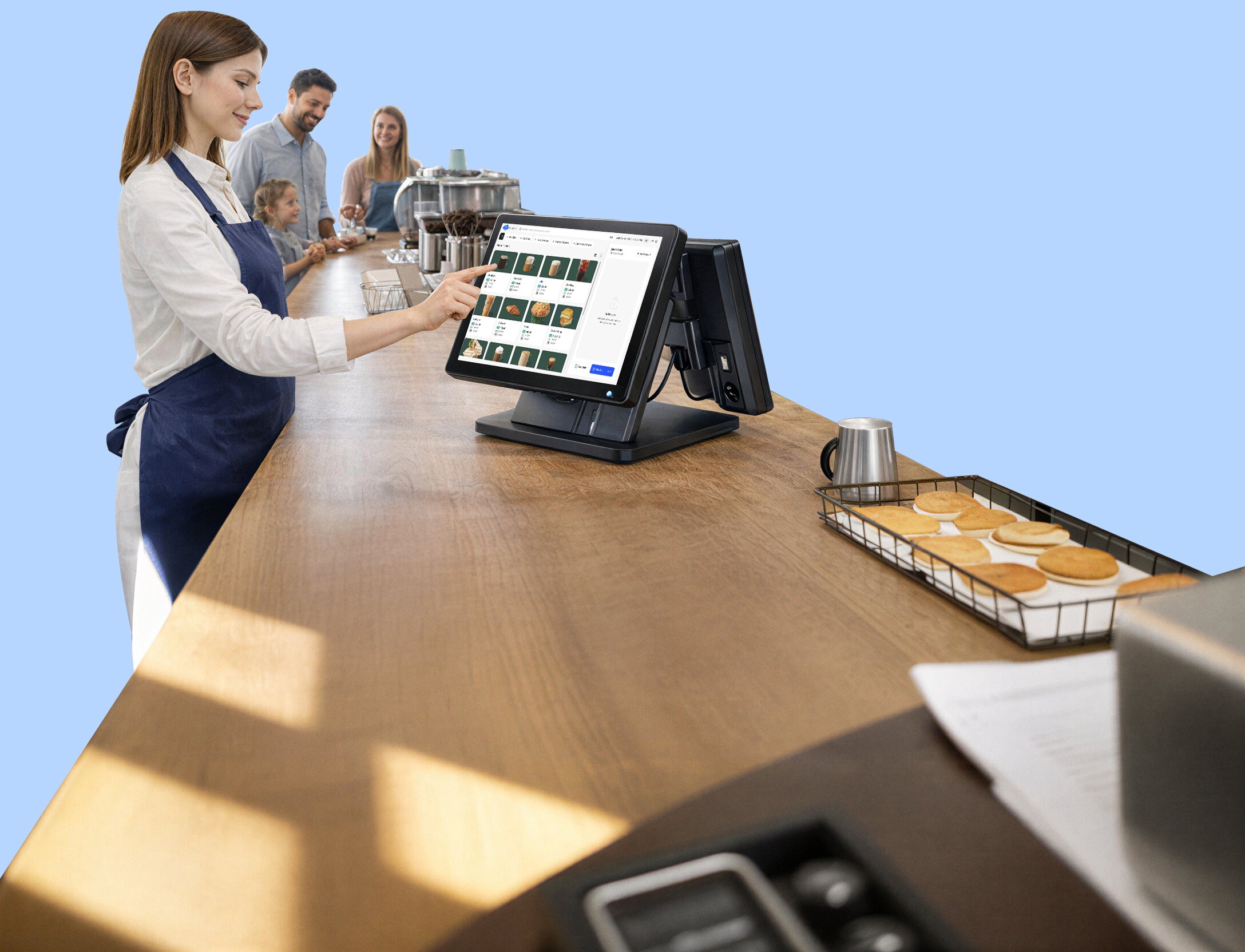 Choose the right POS terminal for your counter — from Mini to single-screen and dual-screen setups — with optional accessories like receipt printers, barcode scanners, and cash drawers.